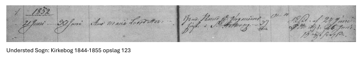 Ane Marie Larsdatter blev født i Hørby Sogn i 1814 og var datter af Lars Jespersen og Mette Christensen. 21 år gammel er hun fæstet som tjenestepige på gården Hestvang i Understed Sogn. Gårdfæsteren hedder Christen Pedersen og han gifter sig i 1837 med Ane Marie Larsdatter. Christen Pedersen dør i 1841 og gården købes af Christen Madsen som også gifter sig med Ane Marie. I dette ægteskab kommer blandt andre sønnen Niels Christian Christensen. Han bliver født i 1842 og bliver senere gift med min mormor Elise Petrine Christensen. Ane Marie Larsdatter bliver enke igen i 1849 og gifter sig året efter Med Knud Christian Jørgensen. Ane Marie Larsdatter dør den 21. juni 1852 44 år gammel.
