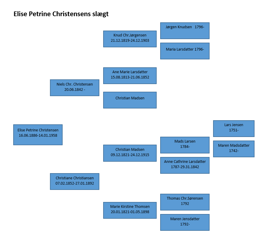 Elise Petrine Christensens mor Christiane Christiansen blev født 7. februar 1852 i Flade sogn. Hendes forældre var gårdmand og sognefoged Christian Madsen i Sønder Fladberg og Marie Christine Thomasdatter. De bor på Øster Præstegaard i Gærum