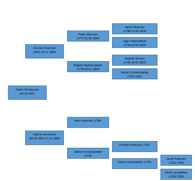 Frants Kristensens mor hed Sophie Hansdatter og hun var datter af Hans Andersen og Mette Christensdatter på gården Degnbøl i Mygdal Sogn. Sophie Hansdatters søster Maren udvandrer i 1865 til Amerika (se historien). Gården var tidligere fæstegård under herregården Odden. Frants Kristensens far hed Christen Pedersen og var søn af Peder Sørensen og Birgitte Stephansdatter der boede i Bjergby Nordremark, hvor Peder Sørensen var gårdejer. Sophie Hansdatter og Christen Pedersen bliver gift i Mygdal KIrke den 10. november 1838. De har overtaget gården i første omgang er Christen bestyrer for moderen og senere som ejer. Gården kaldes Nørmark. Udover at være gårdejer bliver Christen Pedersen også sogneforstander og senere sognefoged. De får 8 børn deriblandt Frants Kristensen som bliver født i 1848.